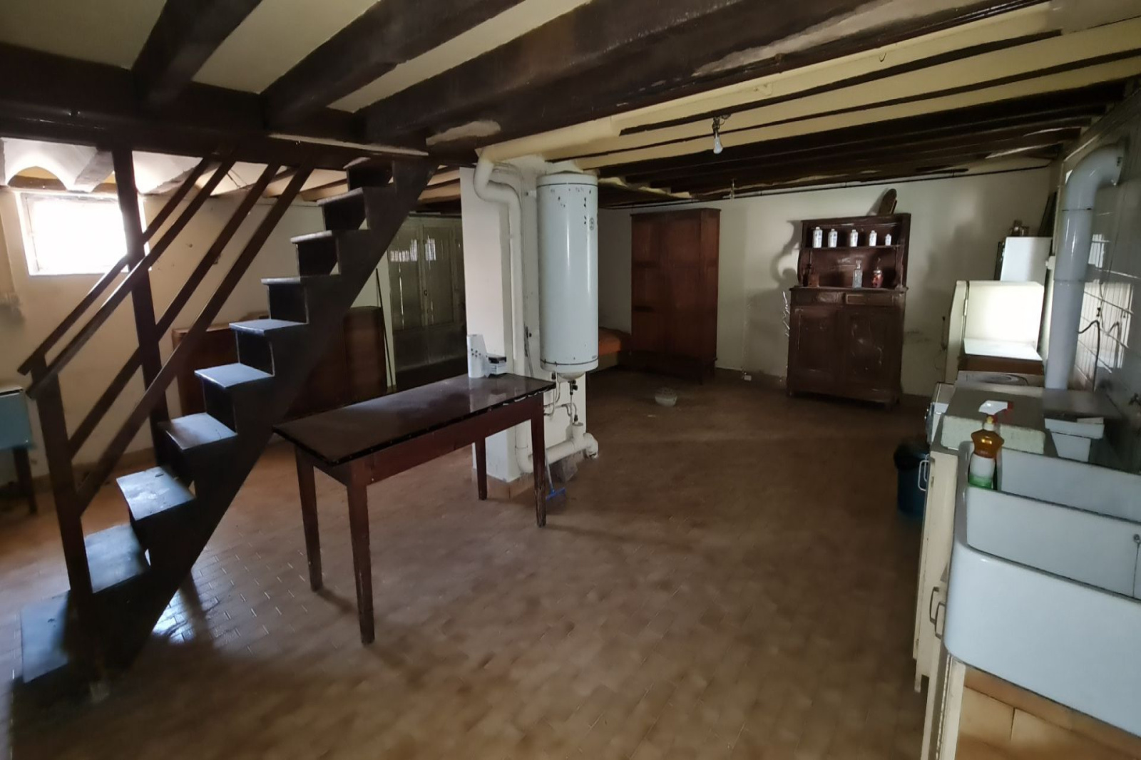 C'est une très grande pièce de 62 m² qui était à l'origine une cuisine d'été. Il sera facilement possible de l'agencer à votre façon. Ce niveau est accessible par une entrée à l'arrière et par un escalier venant du 1er étage, il y a aussi une fenêtre et une baie vitrée.