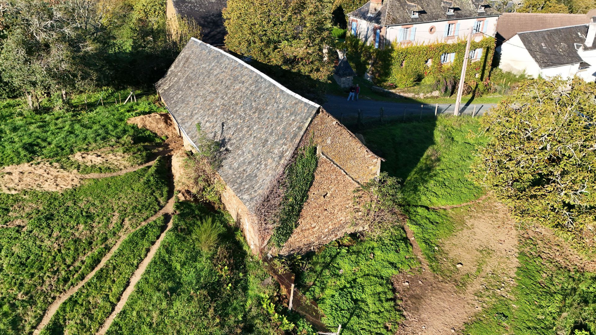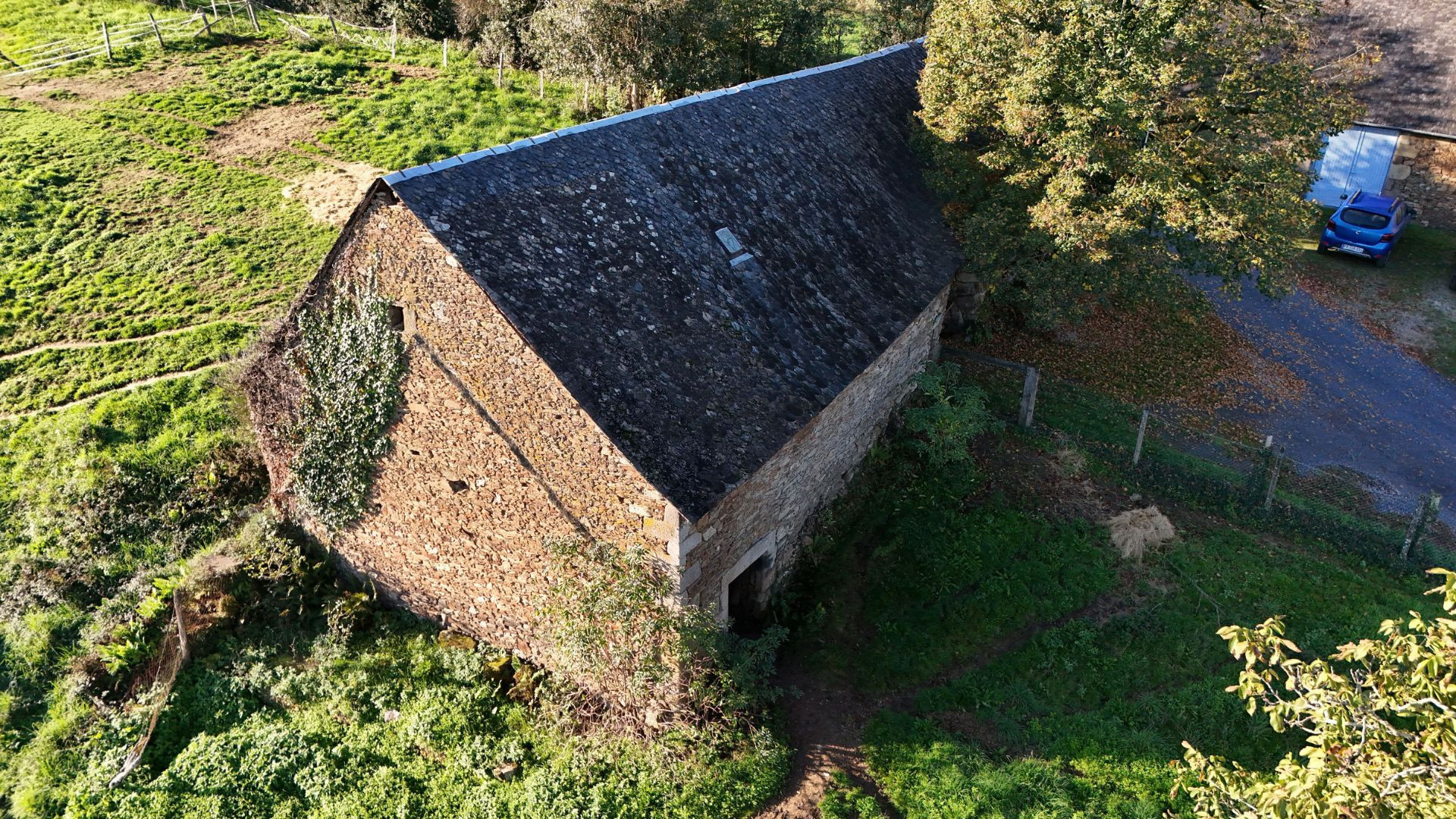 La grange dispose d'une structure saine, avec des murs en pierre, une charpente en bois en bon état et une couverture en ardoise de pays.
